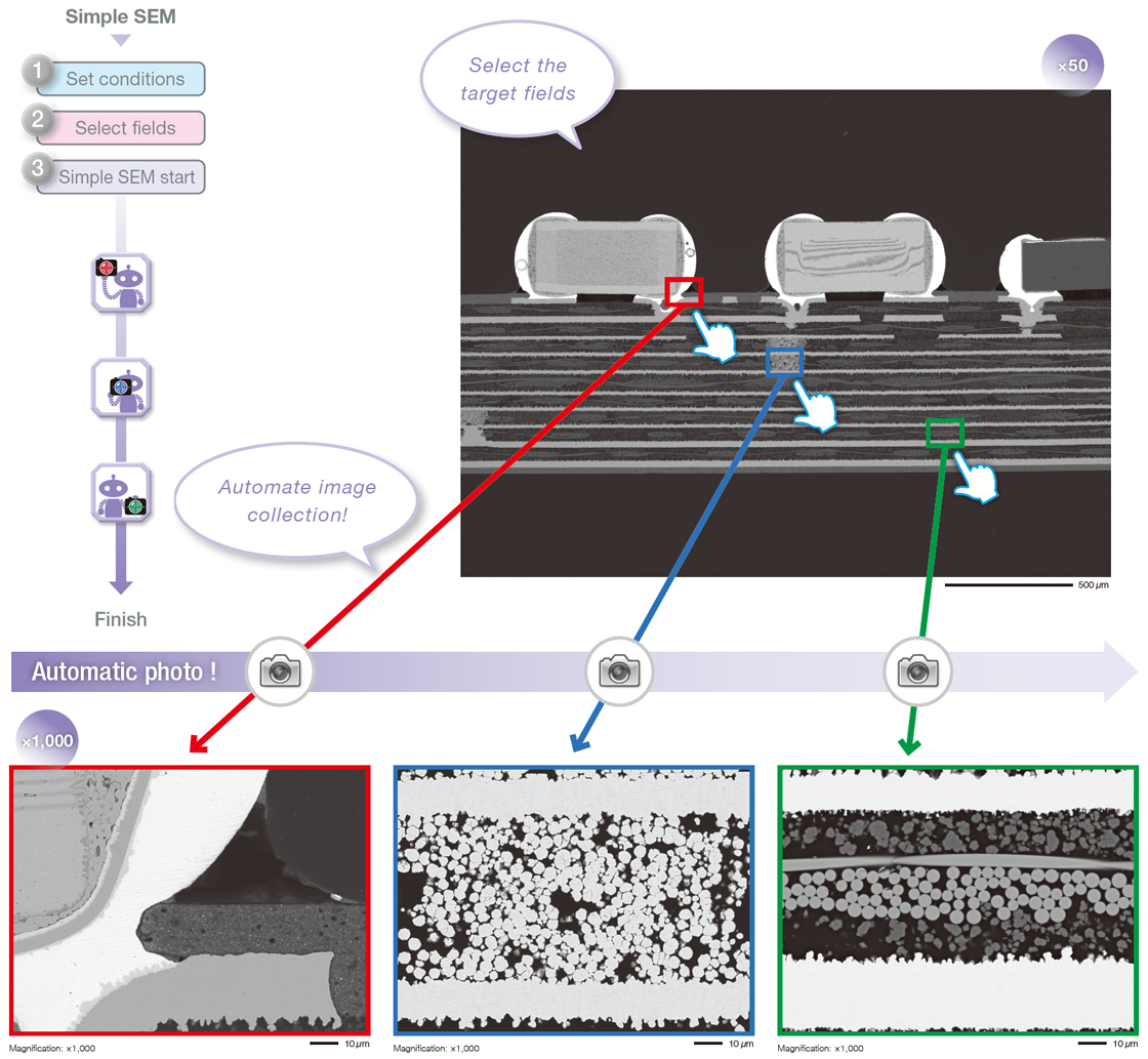Scanning electron microscopes (SEMs) are indispensable tools not only for research but also for quality assurance and manufacturing sites. At those scenes, the same observation processes need to be performed repeatedly and there has been a need to improve the efficiency of the process.