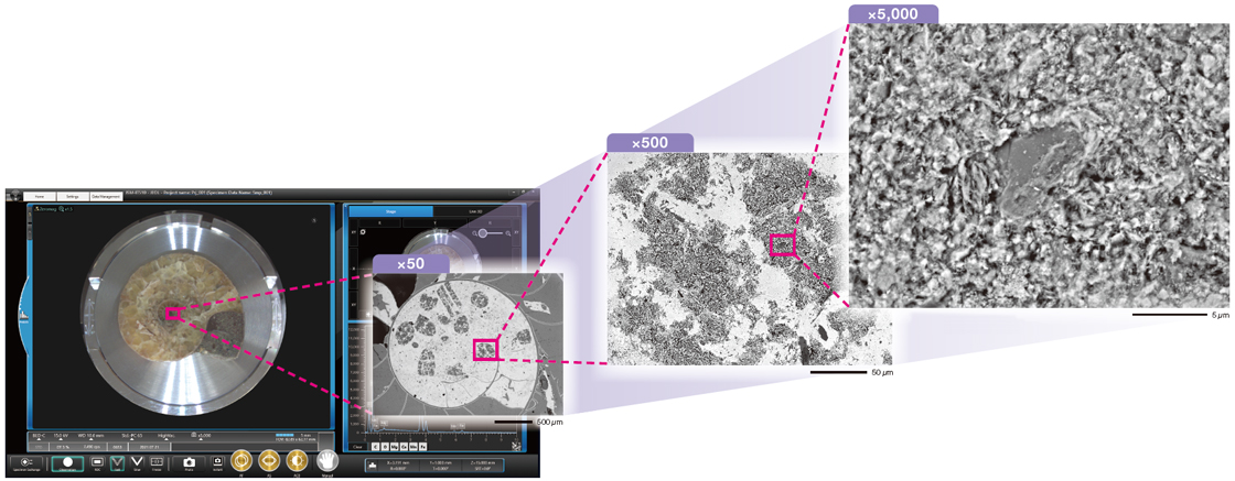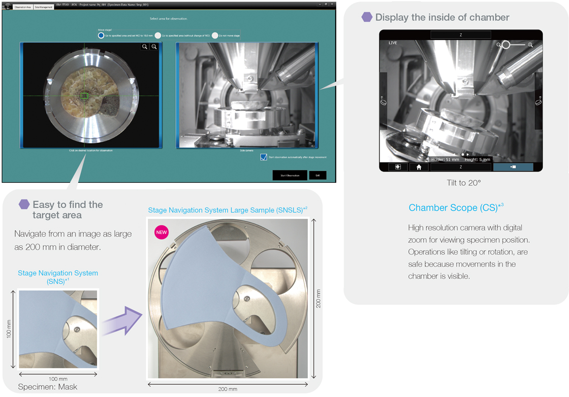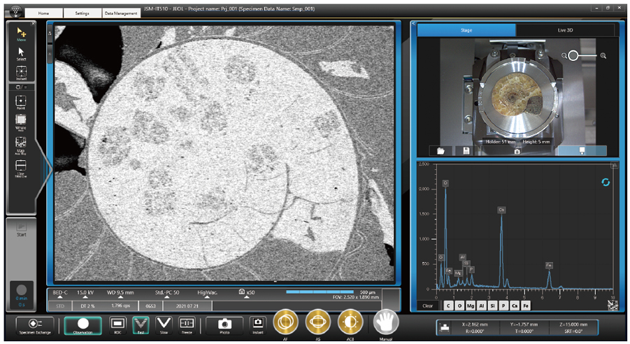 With the JSM-IT510, the newly added Simple SEM function allows users to "leave the manual repetitive operation to it", required for SEM observation, making SEM observation more efficient and easier.