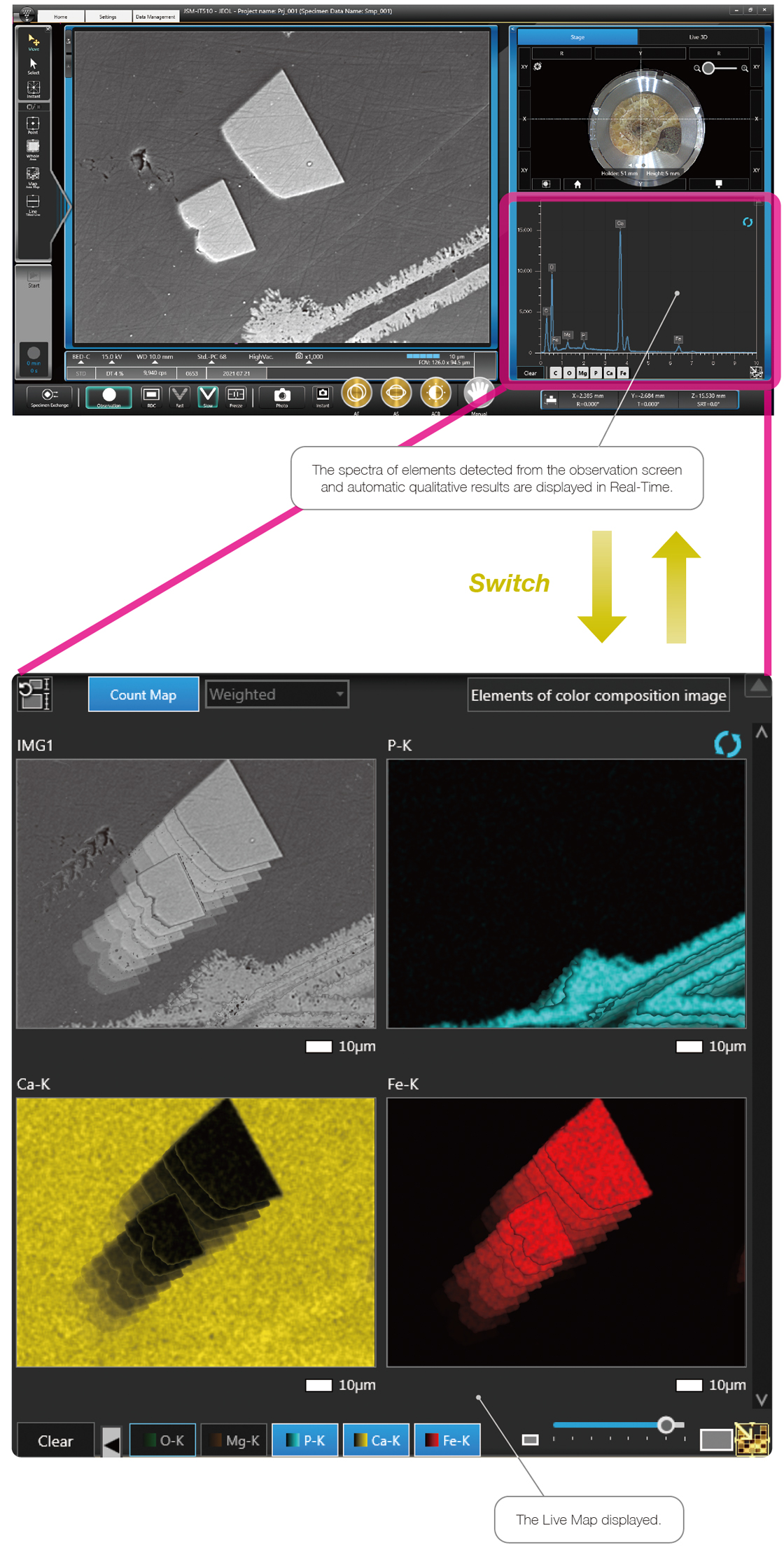 Live Analysis is a function which displays the EDS spectrum or element maps in Real-Time during image observation. This function can support searching and provide an alert for target elements.