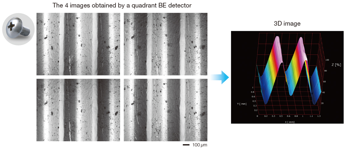 The images obtained by a new quadrant BE detector* can be displayed as a live 3D image. 3D images can clearly represent the shape of a specimen, even for those with subtle topographic information.