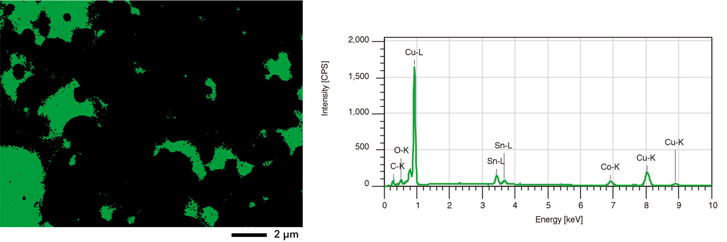 Specimen: cross section of a cutting tool for precision machining. Phase analysis indicates component difference between Co, Cu and Sn rich areas. |